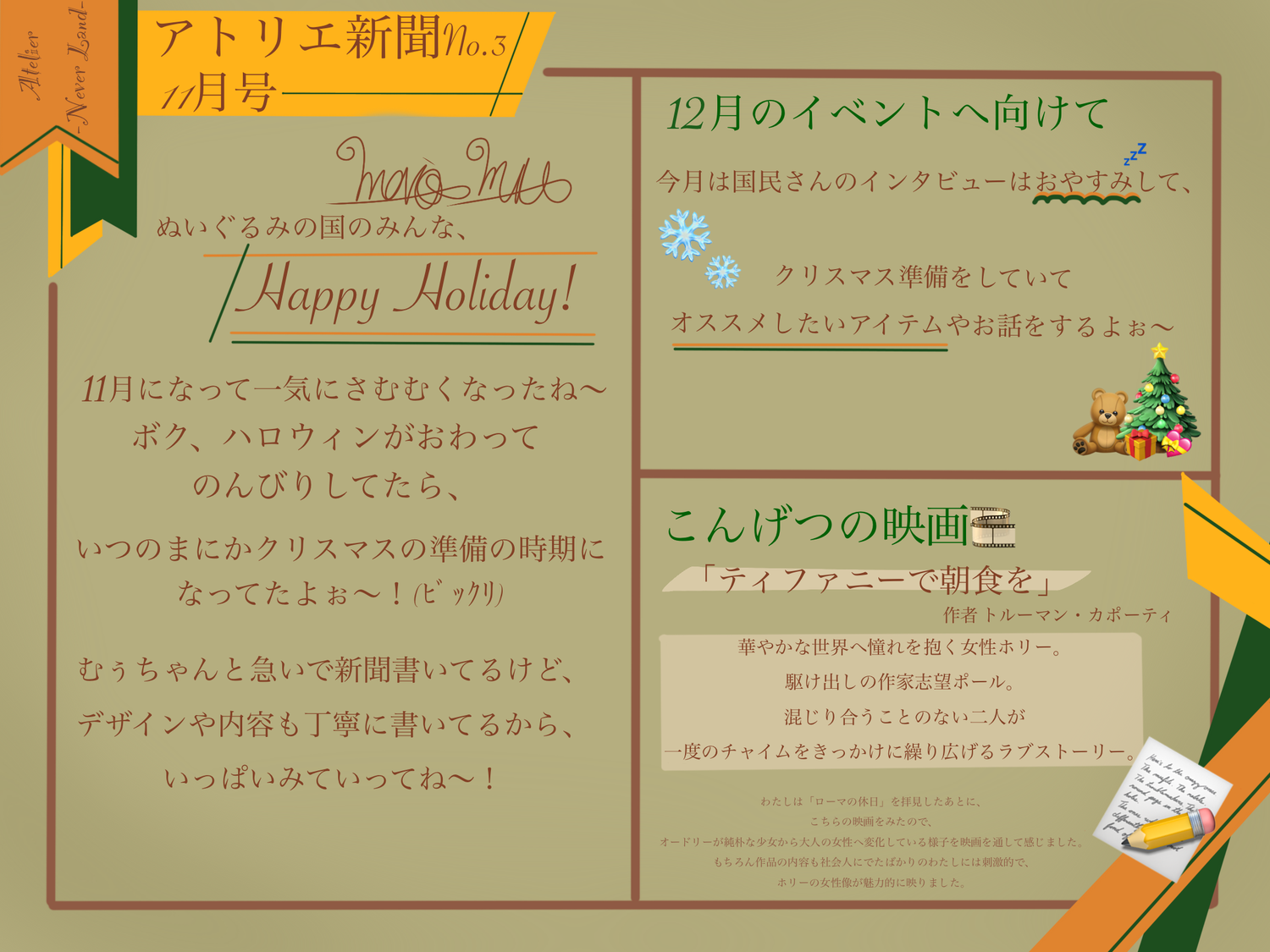 おいそがしかったり、かなしいことがあったぬいぐるみさんやご家族さまもいるとおもうから、今月の新聞もみんなのおきもちに寄り添える内容にできてるといいなぁ〜