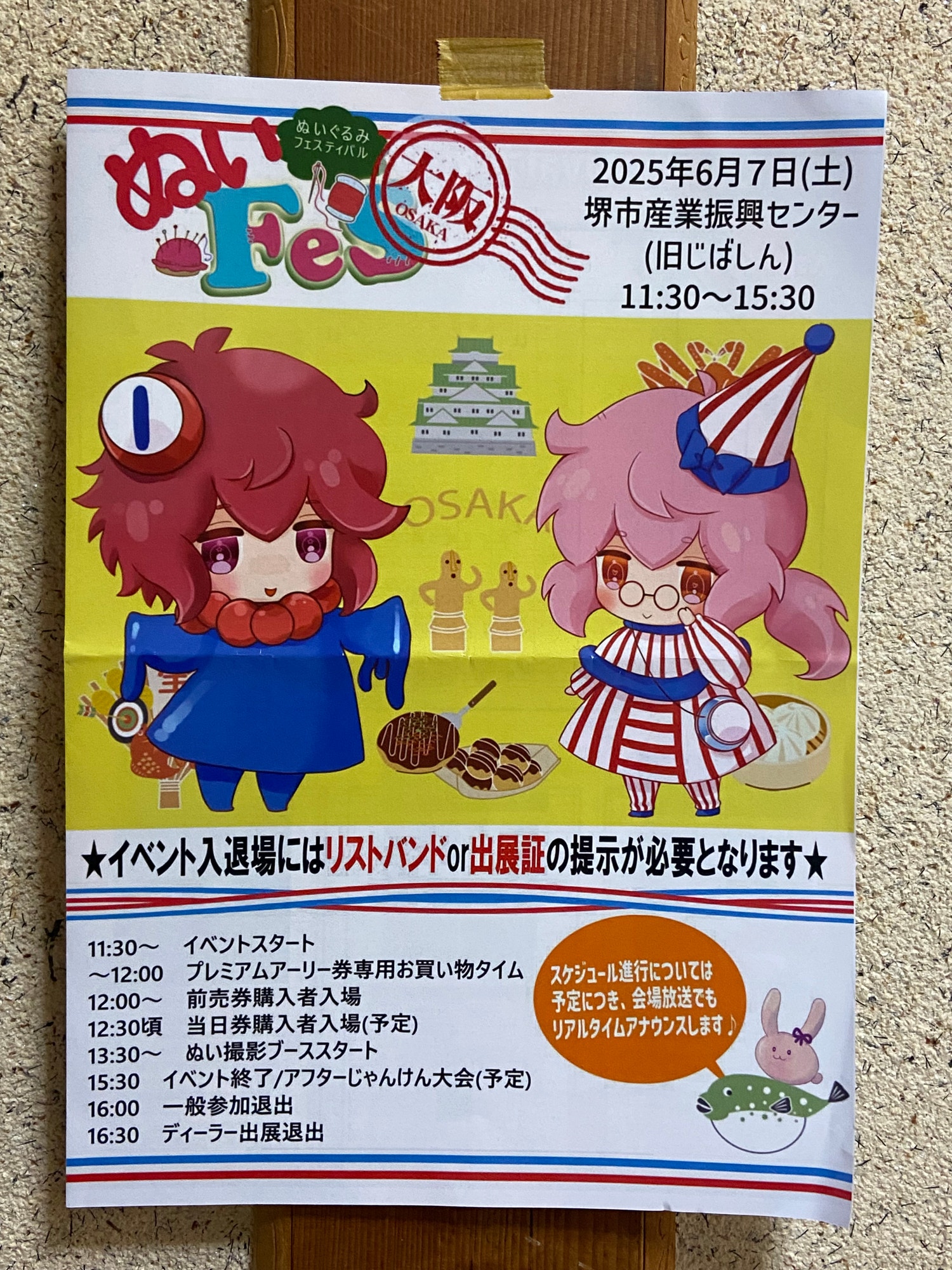 土曜日、私は獅子狩と『ぬいFes』なるイベントに出かけた。これがイベントのチラシ。何だか左のイラストの子がミャクミャクっぽいような……?右はくいだおれ人形っぽいし……?